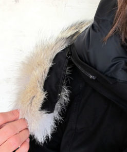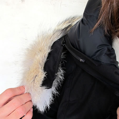 調節可能な着脱式ダウン入りフードを採用。フードのコヨーテファーも、洗濯しやすいよう着脱可能